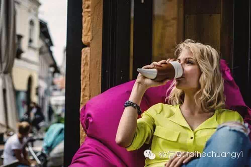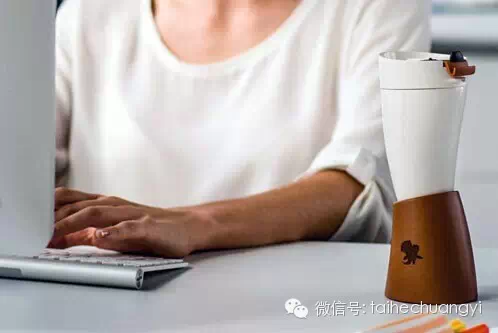 desnahemisfera设计的羊角咖啡杯,羊角形状,有助于人们将杯子里最后一滴咖啡喝光。杯子中间皮革制作的杯套是防水的,取下之后还可以做杯子的底座,让杯子安稳地放于任何桌面上。它还配备一长一短两根带子,可将咖啡杯悬挂在背包或是肩膀上。